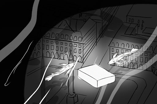 In the still relative darkness, the carp moves with grace and elegance, illuminating streets and monuments that appear to be in Paris.